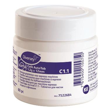 Diversey Suma Cafe C1.1 are powerful cleaning tablets for the daily cleaning of traditional and fully automatic espresso machines, coffee machines and separate parts such as brewing units or filter holders. The tablets dissolve in a controlled manner and combine effective cleaning with thorough rinsing, so that coffee residues and fats are completely removed. They are odourless, phosphate-free and biodegradable and come in a 2×60 pack that is fully recyclable. These tablets are designed for a wide range of professional coffee machines and contribute to a longer service life and optimal hygiene of the appliance. Supplied in a box of 2x60 pieces. Cleaning tablets for daily maintenance of espresso and coffee machines. Diversey Suma Cafe C1.1 cleaning tablets (2x60 pieces) for espresso machine